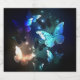 Fantastisk, glödande, blå och gult, nattfjäril mot mörkens bakgrund.