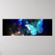 Fantastisk, glödande, blå och gult, nattfjäril mot mörkens bakgrund.