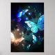Fantastisk, glödande, blå och gult, nattfjäril mot mörkens bakgrund.