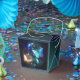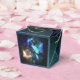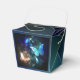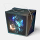 Fantastisk, glödande, blå och gult, nattfjäril mot mörkens bakgrund.