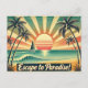 Här är vykortet vintage resor med en tropisk strand med högt handflatan träd, mjukt vågar och en segelbåt som seglar över vatten. 🌴 🌞 sol kastar en gyllene glöd över scenen, med mjuka pastellnyanser i himmel. Den fet typografin från 1950-talet-stil lyder "Escape to Paradise!", ge det till ett nostalgiskt, strandinspirerat vibe.