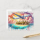 Här är vykortet för färgen stil med ett elegant flygplan som flyger över en tropisk ö med gyllene stränder, handflatan träd och turkos vatten, som alla är målade med fluida penseldrag. ✈️ 🌅 Den levande solnedgången blandar orangens, rosans och lilans nyanser. Texten "Escape to Paradise." är i elegant, flyter skript med vattenfärgen struktur och skapar en drömmande, flyginspirerad vibe