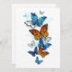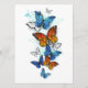 Flygande, skarp, blå fjärilsmorfo och orange-marschfjäril på vit bakgrund. Morpho. Monarch-fjäril. Design med fjärilar.
