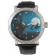 en häxa som flyger på sin kvast förbi fullmånen med ett mörkt hus i bakgrunden och en katt på staketet
