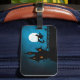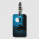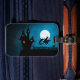 en häxa som flyger på sin kvast förbi fullmånen med ett mörkt hus i bakgrunden och en katt på staketet