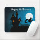 en häxa som flyger på sin kvast förbi fullmånen med ett mörkt hus i bakgrunden och en katt på staketet