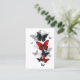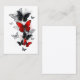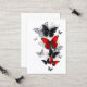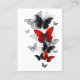 Flocket av flygande, realistiska, röda och svarta morfobutterflugor på vit bakgrund med färgdroppar.