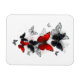 Flocket av flygande, realistiska, röda och svarta morfobutterflugor på vit bakgrund med färgdroppar.
