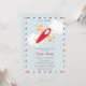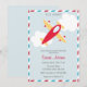 Babyduschinbjudan med flygplanstema och flygpost blå röd bakgrund.
