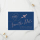 Destinationsbröllop för Rosor och marinblått resetema för ro Spara datumkortet med ett romantiskt flygplansmonogram, plus elegant minimal modern typografi. Klicka på "Anpassa ytterligare" om du vill ha redigeringsfunktioner för extra, t.ex. att ändra färg, teckensnitt och layout. Underbar för de platser där dina gäster ska resa till tropiska platser, strand, ö, stad, berg och äventyr. Kolla vår designerbutik efter tonvis med samordnande artiklar!