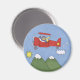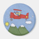 En pojkpilot flyger genom himlar på sitt röda flygplan.