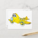 Ett tecknad med viskartad gult passagerarplan med blå näsa som flyger över det vänskapliga himlar.