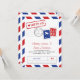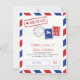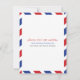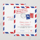 Flygpostinspirerat Spara Datum-kort i ljust rött och kungblått. Falskt frimärke och poststämpel för en resa-tematisk bröllop.