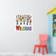 Flyktingar och migranter Välkomsthetskonstruktion är stick figurer från många färg i en vänligt sinnad grupp - att fira mångfald, nyanlända och att se till att flyktingar och migranter välkomnas.