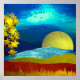 Ett vackert landskapslandskap med ett unikt himmel som liknar krämer i flytande form och måne, berg och ett gyllene träd.