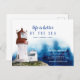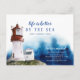 Vackert vattenfärgsmeddelande om ett nytt hem med ett kust rött och vitt fyr med mörk blått vattenfärgstvätta.