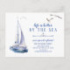 Det moderna tillkännagivandet om flytta vid kusterna med en sjöbåt med vattenfärg, en ankarlinje med delare och fiskmås