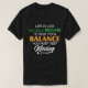 Den här svarta t-shirten innehåller det inspirerande citatet "LIV ÄR SOM ATT RIDERA EN Bicycle FÖR BEHÅLLA DIN BALANS DU MÅSTE BEHÅLLA Flytta". Orden "Cykel" och "Flytta" är i grönt och "BALANS" är i orange, medan resten av texten är vit. Användorna för utformningen varierade i typsnitt för att betona nyckel ord.