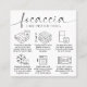 Minimalistiska Focaccia Care-kort med kalligraferingsteckensnitt och försiktighetsikoner för elegant. I den här moderna handboken för central brödvård på svarta och vita källor ingår de viktigaste lagrings- och upphettningstipsen med ikoner för varje steg, så att dina kunder vet hur de bäst förvarar och färskkoncentrat. Du kan anpassa alla skötselinstruktioner, lägga till logotyp- och kontaktinformation till detta kort för att skapa anpassningsbarnas bagerikort.