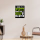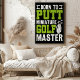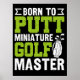 Denna djärva illustration firar en mästare på miniatyrgolf. "BORN TO" är överst i vitt, inramat med geometriska accenter. Nedan visas "PUTT" på en framträdande plats i ett sviktande teckensnitt med vibrerande grönt. "MINIATUR" i vitt leder till "GOLF" i grönt, åtföljt av en golfpåse fylld med klubbar i vitt. Texten "MASTER" i grund är vit. Den övergripande designen har en tålig, blockerad, estetisk perfekt för en passionerad minigolfer.