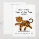 Meddela om födelsen av din tiger-bebis med detta kort med en tiger som har det kinesiska tecknet för "Tiger" skrivet på dess bakdel och de tidigare åren för detta stjärntecken skrivna under för referens. Skriv ditt personliga meddelande eller rubrik på baksidan av detta kort. Bebisar födda mellan 1 februari 2022 och 21 januari 2023 kommer att ha tigern som stjärntecken för livet.