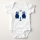 Två blå ugglor på en vit barnklänning för barnets första födelsedag. Jag är ett.
