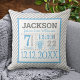 Bedårande söt blå och grå och vit randig födelseannonseringsdyna för babypojke med en söt liten blå elefant. Redigera för att inkludera alla dina älskade lilla barns födelsedetaljer.
