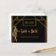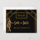 Elegant faux guld och glam i 50:e födelsedagsfesten (eller i vilken ålder som helst)! Födelsedagsfesten Art deco stil Spara datumkortet i faux guld och svart för en glamorös firande. Dekorerad med 1920 års stil flapper-flicka och konst deco stil ram. Mallar för ett datum och namn/ålder. Det här kortet finns också i vår butik med en svart bakgrund färg på baksidan. Tips! Om du inte vill att det ska se ut som ett vykort klickar du på anpassa, går till baksidan och tar bort delaren och lägger till frimärke.