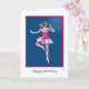 Den vackra lilla ballerina strejkor en attitydform i hennes rosa och vita dräkt på blå bakgrund. Hon bär vita handskar och har ett vitt band i håret. Hennes rygg vänder sig till publiken. Det gör en underbar balett temabild på det här färgstarka födelsekortet.