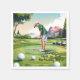 En levande illustration av en ung golfer som firar en födelsedag med ett spel på en solig, scenisk golfbana. Barnet är omgivet av golf bollar, lush grey och golfkartor och är inriktat på att skapar perfekten. Bergsområden och träd i bakgrunden har en fredlig, festlig ton - perfekt för ett golftemaformat födelsedagsfirande.