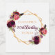 En chic vit bakgrund med faux guld geometric ram. Dekorerad med mörkens lila och burgundblommor, ro och boho stil fjädrar. Mallar för namn och datum. Födelsedatum eller datum för party, brev i. Med texten: 70:e födelsedag skrivet med ett burgundsskript i stil.