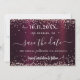 A Spara datumkortet för en 21:a (eller någon annan ålder) födelsedagsfest. En djup, burgundös metallisk tittar bakgrund som dekoreras med ro guld faux glitter, gnistor. Anpassa och lägg till datum och namn/ålder. Texten: Spara datumet skrivs med ett handskript i stil med dekortecken.