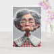 En äldre kvinna med överdrivna egenskaper bär glasögon och en röd-vit gingham blus med en snöre-krage.