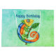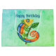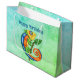Den här presentpåsen är i blå och grönt med en leende fantasi-ödla med stort ögon gjort ljusa färger av blått, grönt, gult och orange. Han håller en käpp med en grönt löv på framsidan och baksidan. Anpassa Grattis på födelsedagen-texten till mallen.