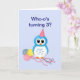 En gullig tecknaduggla med en partyhatt och för pastellfärgad för innehav tre ballonger. Detta kort har text för åriga tre, men det är anpassadet för någon ålder. Du kan tillfoga namn av födelsedagbarnet som väl. Texten är anpassadet på det hela kortet.