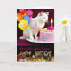 Pappert hälsningskort för en barndotter. Lägg till hennes namn i kortets omslag. En vit katt håller färgfulla ballonger och stirrar på ett tårtljus. Art, bild och versell copyright © Shoaff Ballanger Studios, 2023.