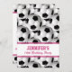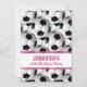 En slå fotbollfotbolldesign som presenterar ett fotbollbollmönster med fotboll, klumpa ihop sig överallt! Texten, som kan skräddarsy, presenteras i rosa text på en vitrand med halva genomskinliga rosa brytningar för att visa mönster under. En underbar födelsedagsfest inbjudan för flickan eller kvinnan som älskar för att leka fotboll eller är en fotbollfläkt.