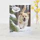 Gult Labrador-hämtare som springer på vintern skogen för födelsedagen humor. All text kan ändras.