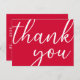 En livfull körsbärsröd bakgrund. På framsidan stor handskriven skrift med texten: Tack. Baksida: Mall för din tacknota och namn/namn. Tips: Om du inte vill att det ska se ut som ett vykort, klicka på anpassa, gå till baksidan och ta bort avdelaren och frimärket.