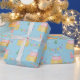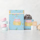 Den pappra inslagningen av rosa, guld och blå födelsedag med födelsedagskaka, party och buntning av flaggor på blå bakgrund.