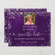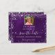 Spara datumkortet glamoröst i 50:e (eller i vilken ålder som helst) födelsedagsfest. Ojämnt fördelad lila färgad. Dekorerad med faux-damm från silver glitter. Texten: Spara datumet skrivs med ett stort trendig-handskript i stil. Anpassa och lägg till ett foto.