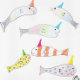 5x7-hälsningskort för porträtt - Många fågeldagskassor för dig - Flera vismfiskar med party har kliat på detta kort. De leker alla och så skickar lycklig sitt goda önskemål till mottagaren. Ursprungligt teckning är färgpenna på pappra, inlästa och placerade på kortet.