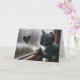 En nyfiken svart och vit kattunge bländar genom ett regnigt fönster, där en hjärtform ritas på dimglaset. Inre text kan ändras.
