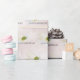 Vit cosmos-blomma på bakgrunden till den rosans abstrakt med Grattis på födelsedagen-text.