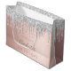 En presentväska för en gigantisk och glamorös 21:a (eller någon ålder) födelsedag. En faux-metall i ro tittar bakgrund med dropparna i ro guld och rosa faux glitter, färgdroppar. Anpassa och lägg till ett datum, namn och 21 år. Texten: namn är skrivet i grått med ett modernt handskrivet stil-skript.