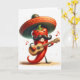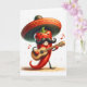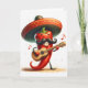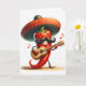 En glad antropomorf röd chilipeppar som bär en stor sombrero och svart mustasch medan han spelar på en gitarr.