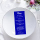 Födelsedagsfest-menyn. Anpassa och lägg till namn, ålder och meny. Royalets blå bakgrund. Vit färgad brev. Du kan lägga till mer text på baksidan om du vill.