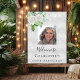Välkomna poster för en 50:e (eller någon ålder) födelsedagsfest. Anpassa och lägg till ett foto, en namn och en ålder. Ett faux silver tittar bakgrund och damm från glitter, dekorerat med vita blommigtar, ro och grön. Bakåt: ingen design.