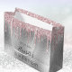 En presentväska för en gigantisk och glamorös 21:a (eller någon ålder) födelsedag. En faux silver metallisk tittar bakgrund med rosa faux glitter drops, färgdroppstift. Anpassa och lägg till ett datum, namn och 21 år. Texten: namn är skriven i svart med ett modernt handskript i stil.