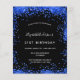 En flickaktig och feminin 21-års (eller vilken ålder som helst) födelsedagsfest inbjudan. Framför: En chic svart bakgrund. Dekorerad med kunglig blå falsk glitterdamm. Personifiera och lägg till ett namn och festdetaljer. Namnet skrivs med en handskriven stilspråk.